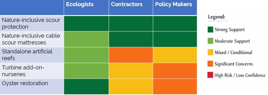 Some of the perceived strengths of Nature-Inclusive designs by contractors during the interactive SWOT analysis were the compatibility with existing scour protection methodologies, and the reduction in amount of time offshore due to combination with existing operations. Conversely, offshore installation costs and programme risk and delays were cited as potential weaknesses of Nature-Inclusive interventions within offshore wind.